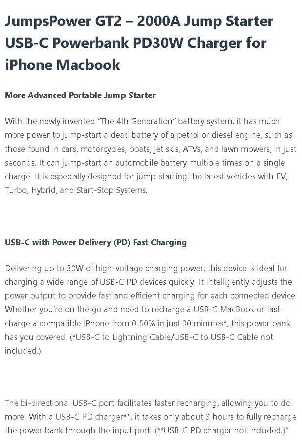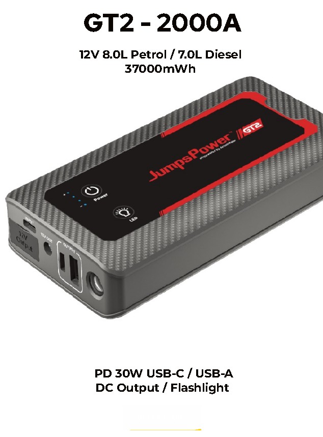 JumpsPower GT2 - 2000A Jump Starter USB-C Powerbank PD30W QC18W ใช้จั๊มพ์สตาร์ทรถ/เรือ และ เป็นเครื่องชาร์จสำหรับ iPhone Macbook android ฯลฯ