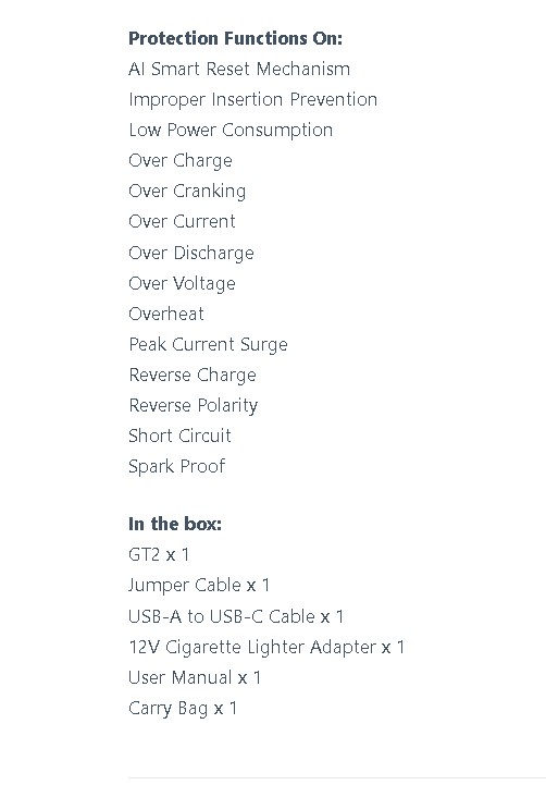 - JumpsPower GT2 ถูกออกแบบให้เหมาะกับการใช้งานร่วมกับเครื่องยนต์ขนาดใหญ่ เช่นในรถบรรทุกและรถ SUV รวมทั้งยานพาหนะเครื่องยนต์ดีเซลด้วย 12V / 2000A*