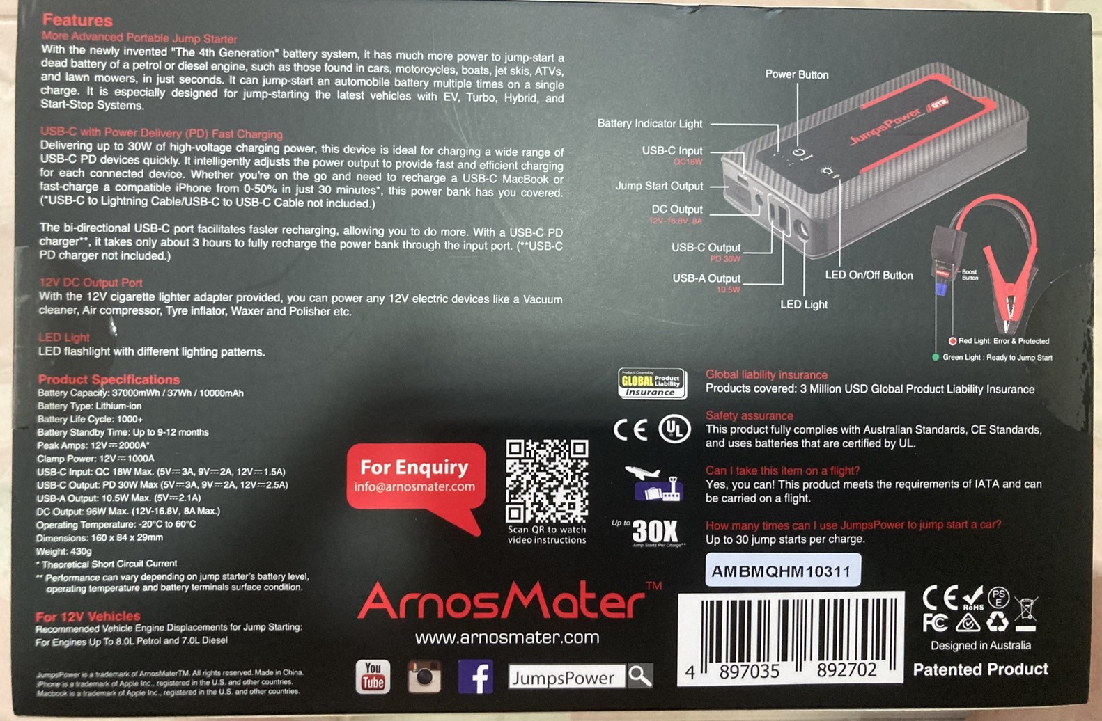 เครื่องจั๊มสตาร์ทแบบพกพาขั้นสูงนี้มาพร้อมกับระบบแบตเตอรี่ "เจเนอเรชั่นที่ 4" ที่พัฒนาขึ้นใหม่ซึ่งให้พลังในการสตาร์ทรถยนต์ 12V ได้มากขึ้นอย่างมาก